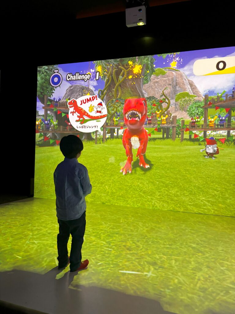 「ジャンプ!」の合図に合わせて、息子は一生懸命跳ねて恐竜を避けるチャレンジに挑戦。